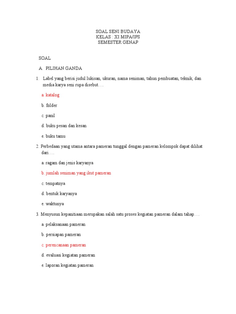 Seni Budaya merupakan mata pelajaran yang menggali kekayaan ekspresi manusia melalui berbagai medium. Untuk siswa kelas 11, pemahaman mendalam tentang konsep seni dan budaya sangat penting. Artikel ini menyajikan 40 soal pilihan ganda yang mencakup berbagai aspek Seni Budaya, disertai jawaban dan penjelasan ringkas. Tujuannya adalah untuk membantu siswa menguji pengetahuan mereka, mempersiapkan diri untuk ujian, dan memperdalam apresiasi terhadap seni dan budaya Indonesia serta mancanegara. Artikel ini akan dibagi menjadi beberapa bagian (Part 1, Part 2, dst.) agar lebih fokus dan tidak terlalu panjang.