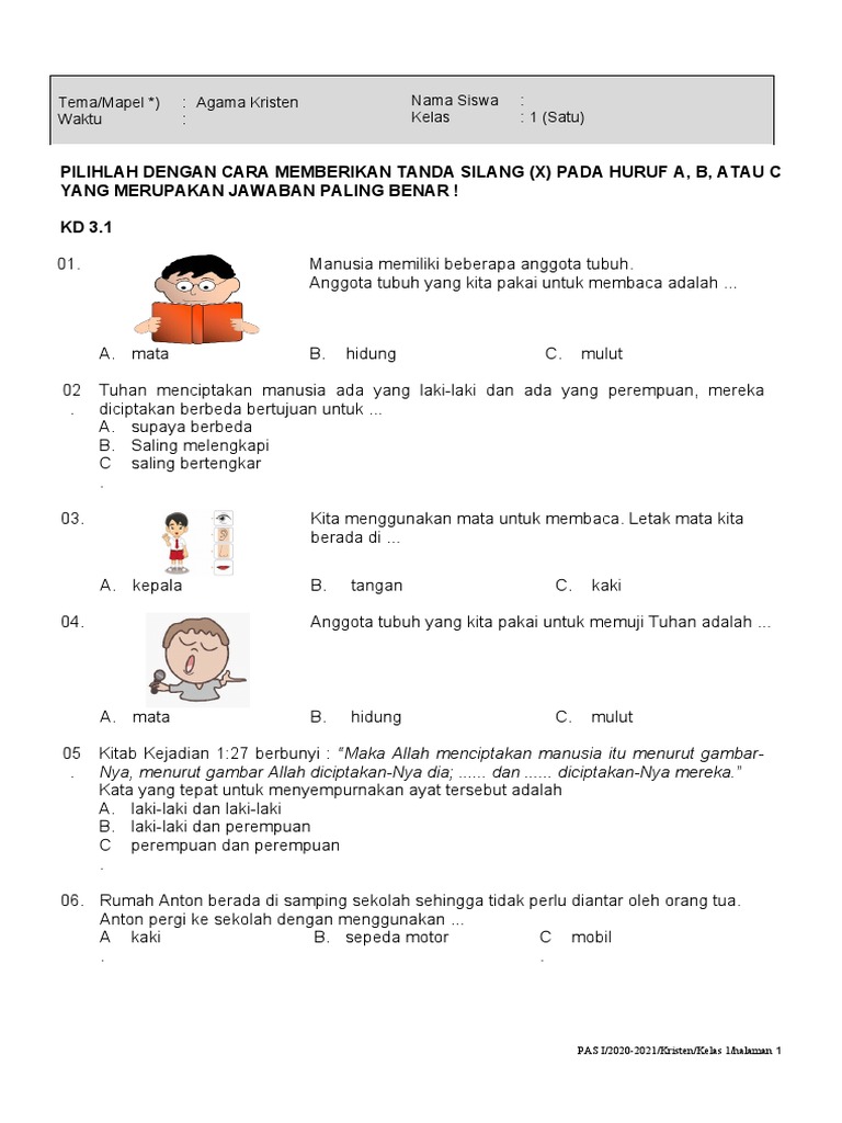 Pendidikan Agama Katolik di kelas 1 Sekolah Dasar (SD) memiliki peran krusial dalam membentuk pondasi iman yang kokoh bagi anak-anak. Kurikulum 2013 (K13) dirancang untuk memperkenalkan dasar-dasar ajaran Katolik secara sederhana dan menyenangkan, sehingga mudah dipahami dan dihayati oleh anak-anak usia dini. Artikel ini akan menyajikan berbagai contoh soal Agama Katolik kelas 1 K13 yang mencakup berbagai aspek, mulai dari pengenalan Allah, penciptaan, keluarga, hingga tokoh-tokoh Alkitab. Contoh-contoh soal ini disertai dengan penjelasan singkat mengenai tujuan pembelajaran yang ingin dicapai, sehingga guru dan orang tua dapat memanfaatkannya secara optimal dalam proses belajar mengajar.