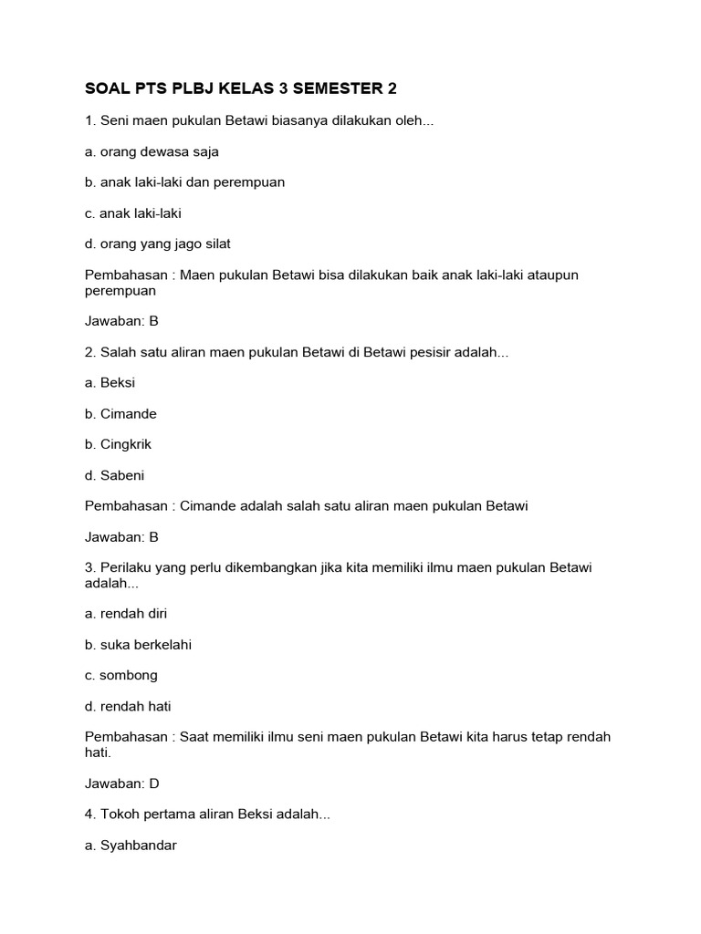 - Pemahaman Mendalam Materi: Soal-soal PAS dirancang untuk menguji pemahaman siswa terhadap seluruh cakupan materi yang diajarkan selama semester. Dengan mengerjakan soal, siswa dapat mengidentifikasi bagian mana dari materi PLBJ yang masih perlu diperdalam. Materi PLBJ sendiri mencakup berbagai aspek, mulai dari sejarah, seni budaya, kuliner, hingga pelestarian lingkungan di Jakarta.